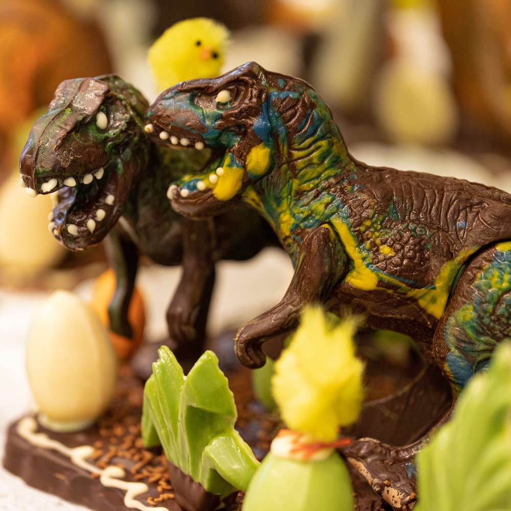 Esta Mona de Pascua de Dinosaurios de Chocolate es una ventana a tiempos prehistóricos, perfecto para los apasionados de la paleontología y las criaturas gigantes.
